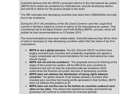 ActionAid believes that the OECD’s proposed reforms to the international tax system (BEPS) fail to tackle tax avoidance by multinationals, exclude developing nations and will fail to deliver for the poorest people in the world.